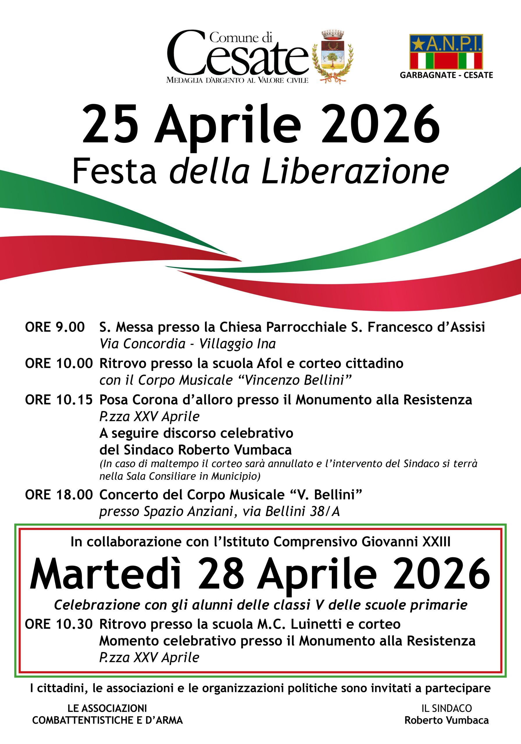 La Cerimonia Istituzionale si terrà sabato 25 aprile alla presenza delle autorità cittadine e delle associazioni locali secondo il seguente programma: