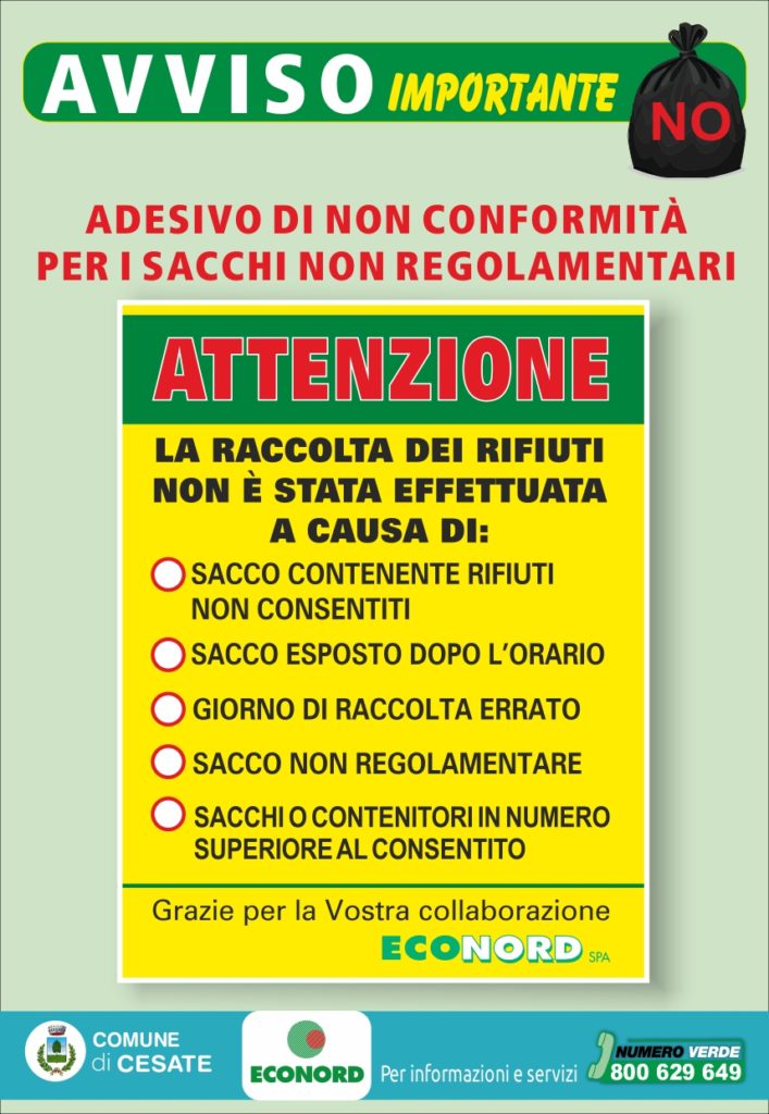 - Dal prossimo 20 gennaio 2025 non verranno più raccolti i sacchi che impediscono di controllare il contenuto dei rifiuti esposti (tipo i sacchi neri che si usavano in passato). In tal modo potremo tutti aiutare a preservare l’ambiente differenziando ancora meglio gli scarti oltre che mantenere contenuto nel tempo l’importo della tassa rifiuti.