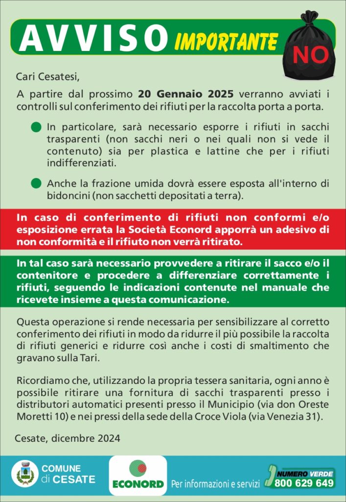 In questi giorni è in distribuzione in tutte le case cesatesi una lettera per il nuovo anno con l’obiettivo di potenziare la raccolta differenziata e ridurre anche i costi di smaltimento dei rifiuti generici che gravano sulla Tari.