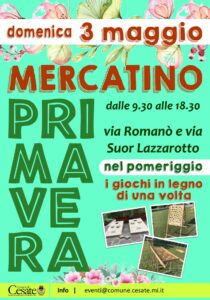 Domenica 3 maggio 2026 dalle 9.30 alle 18.30 vi aspettiamo per una giornata di festa con il tradizionale “Mercatino di Primavera” con espositori di creazioni artistiche, hobbysti, ambulanti, associazioni, con proposte curiose ed introvabili e con idee regalo per la casa ed il tempo libero.