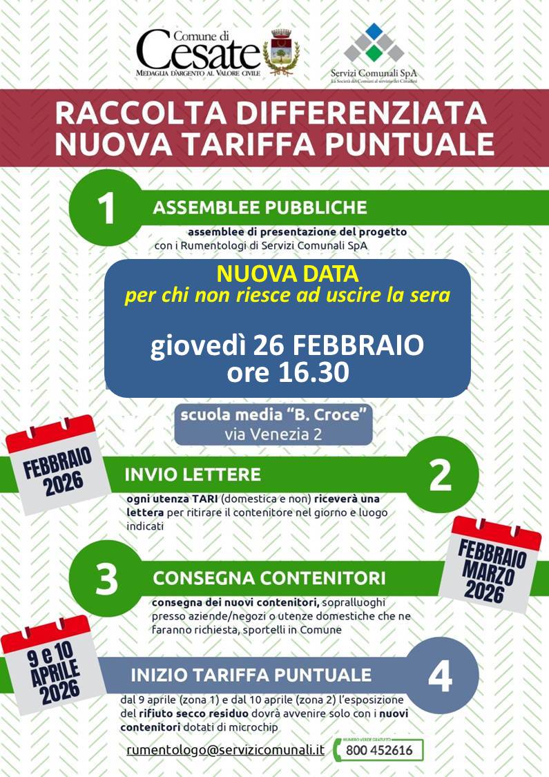 Per venire incontro a chi ha difficoltà a partecipare agli appuntamenti serali, l’Amministrazione Comunale organizza un nuovo incontro pomeridiano dedicato alle novità della Tariffa Puntuale per la raccolta dei rifiuti.