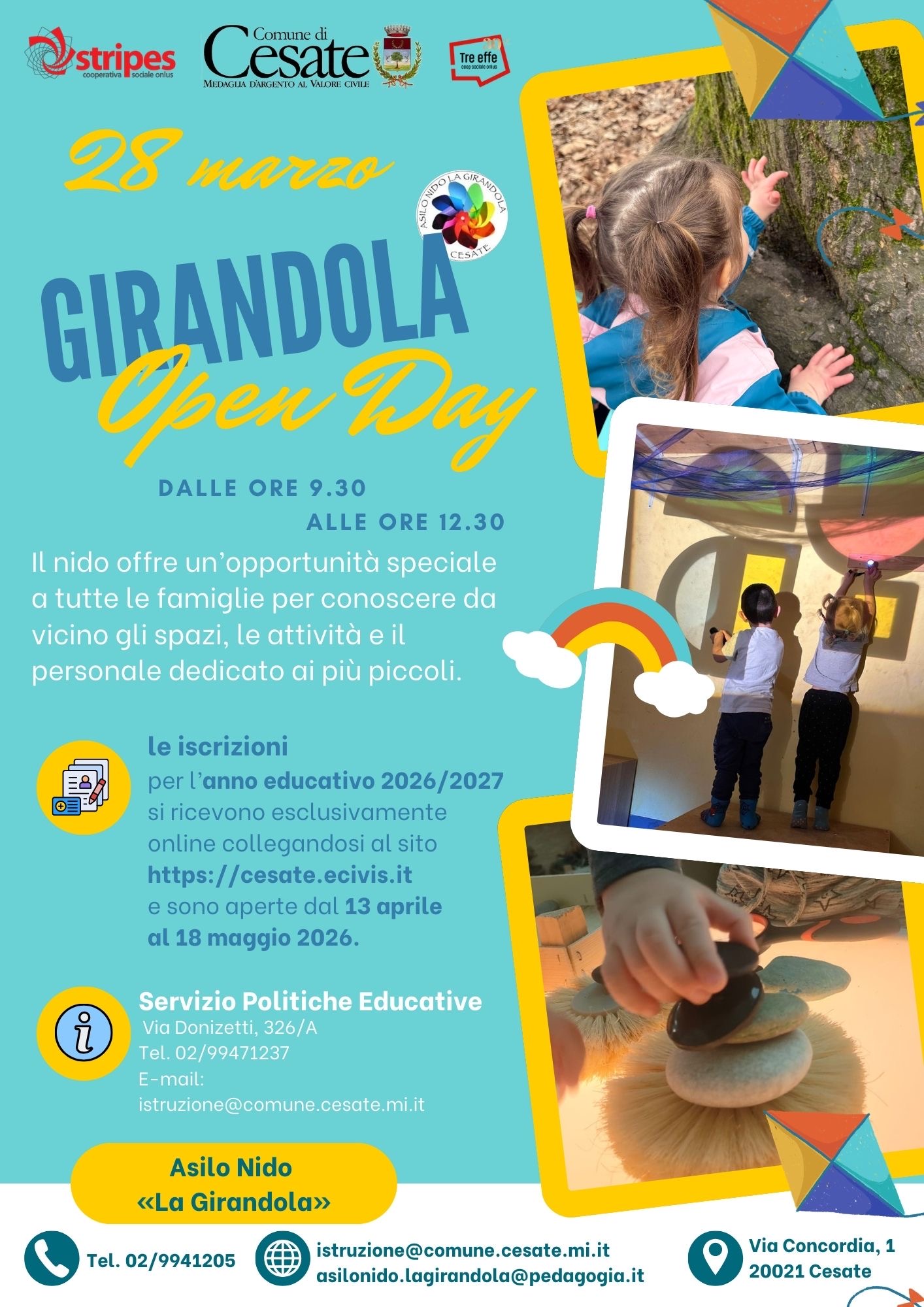 Si comunica che sabato 28 marzo 2026, dalle ore 9.30 alle ore 12.30, si terrà l’Open Day dell’asilo nido comunale “La Girandola”
