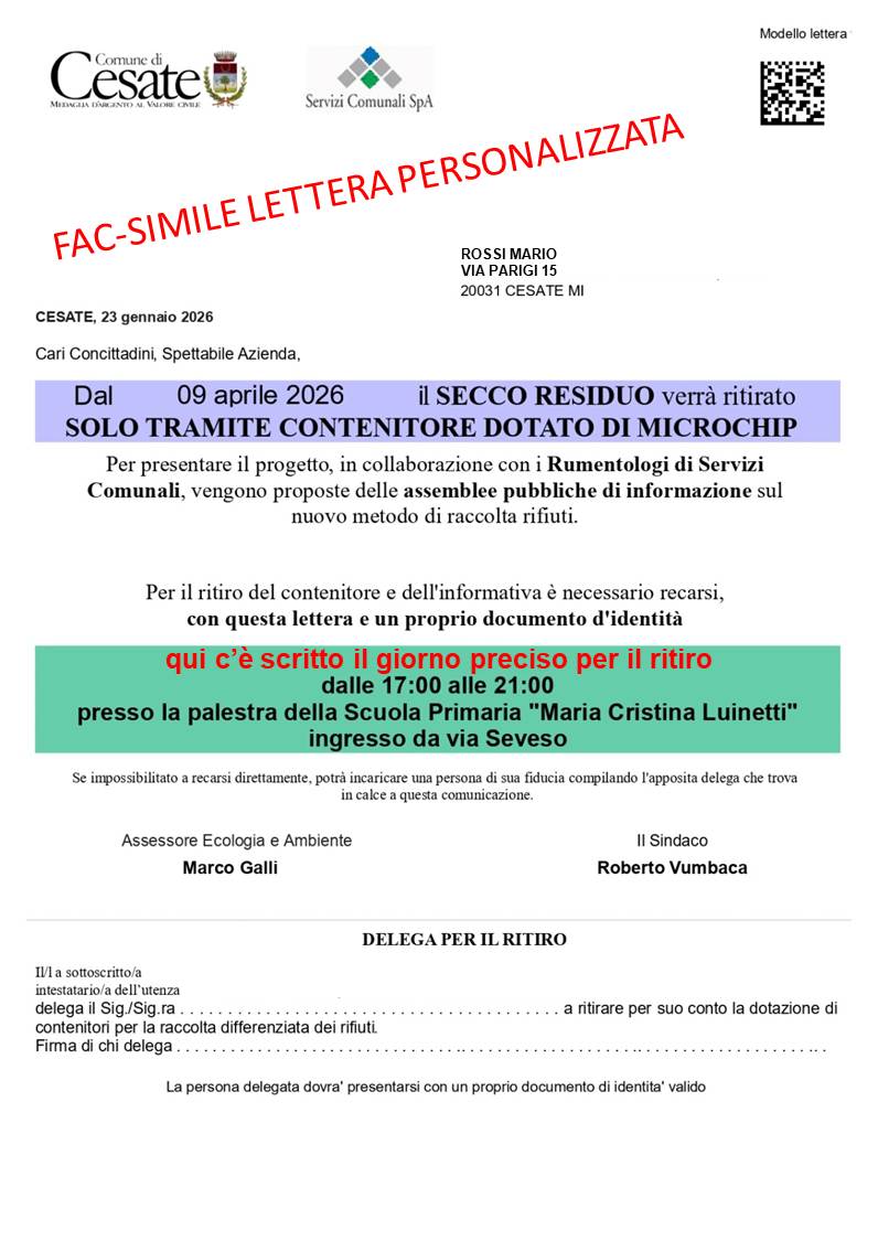 Per garantire un’organizzazione efficiente, circa 500 cittadini al giorno, è importante rispettare il giorno indicato nella lettera. Chi fosse impossibilitato può delegare un’altra persona, compilando l’apposito tagliando di delega presente in fondo alla comunicazione ricevuta.