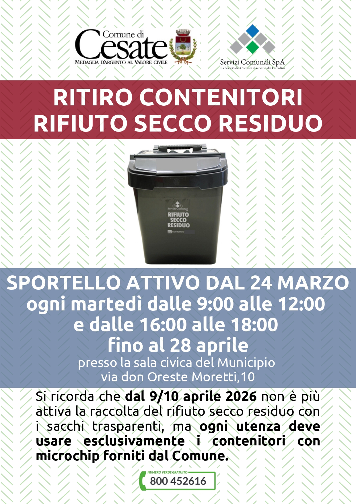 - ⚠️ Dal giovedì 9 e venerdì 10 aprile 2026 sarà necessario utilizzare il nuovo bidoncino con microchip fornito dal Comune.
